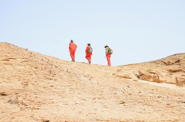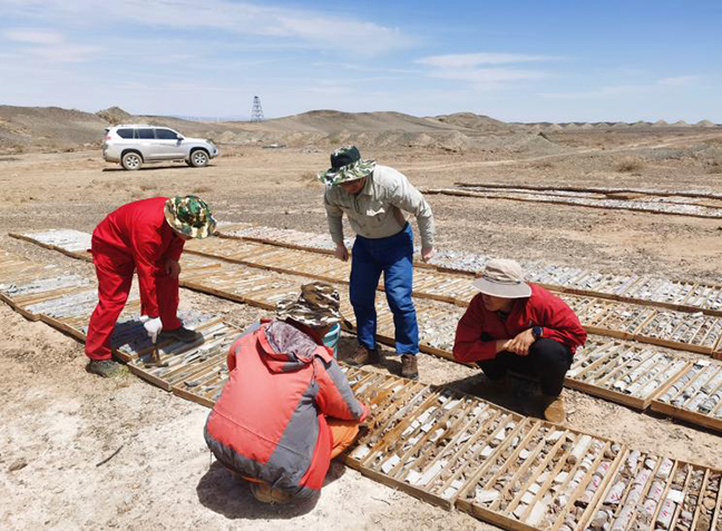 新疆鑫匯公司的野馬泉西金礦項目工作區距離哈密市155公里,工期為6-10月,需完成6千米的鉆探工作任務(wù)、16平方公里的地質(zhì)剖面等。礦區內山丘連綿不絕,自7月開(kāi)始,每天下午礦區地面溫度均超過(guò)普通溫度計的最高刻度,屬于“爆表”狀態(tài)。因工作任務(wù)緊,地質(zhì)隊員們每天早上7點(diǎn)出發(fā),中午之前要返回基地,傍晚重新出發(fā),22點(diǎn)前趕回基地,開(kāi)展剖面測量和鉆探編錄工作,以避開(kāi)正午的酷熱。為了不被灼傷,地質(zhì)隊員和鉆探工人把自己包裹得嚴嚴實(shí)實(shí),手拎地質(zhì)錘敲下每一個(gè)礦化線(xiàn)索,身背樣品包裝載好沉甸甸的希望。汗水浸濕衣衫,腳底磨出老繭,他們踏遍了礦區的角角落落,最終繪制出整個(gè)礦區的礦化藍圖。