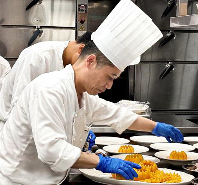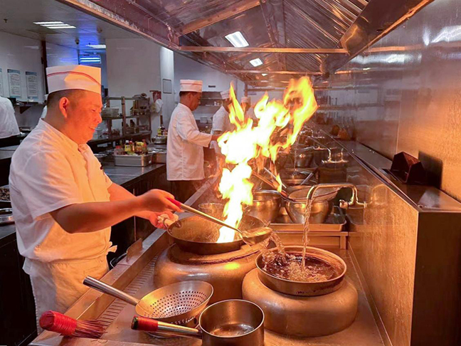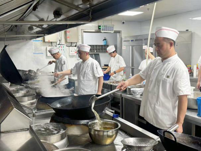 在鹽城迎賓館、國投大酒店、鹽城萬(wàn)豪酒店,后廚內各類(lèi)蒸煮設備持續釋放出熱氣。為了客人味蕾的享受,在高達四五十攝氏度的廚房里,廚師們在灶臺前忙活,耐心細致地烹飪著(zhù)每一道菜肴,洗鍋、倒油、下主料、添配菜,他們一手端著(zhù)鐵鍋,一手用力翻炒,炙熱的火焰不時(shí)從鍋中竄出。對于廚師來(lái)說(shuō),每年7月到9月都是一場(chǎng)漫長(cháng)的考驗,由于大部分后廚油煙大,不適合安裝空調,用大功率風(fēng)扇又會(huì )影響烹飪,所以廚師們的工作服幾乎都是濕的,而正是因為有了他們在高溫下的執著(zhù)堅守,才有了滿(mǎn)足人們味蕾的美味菜肴。