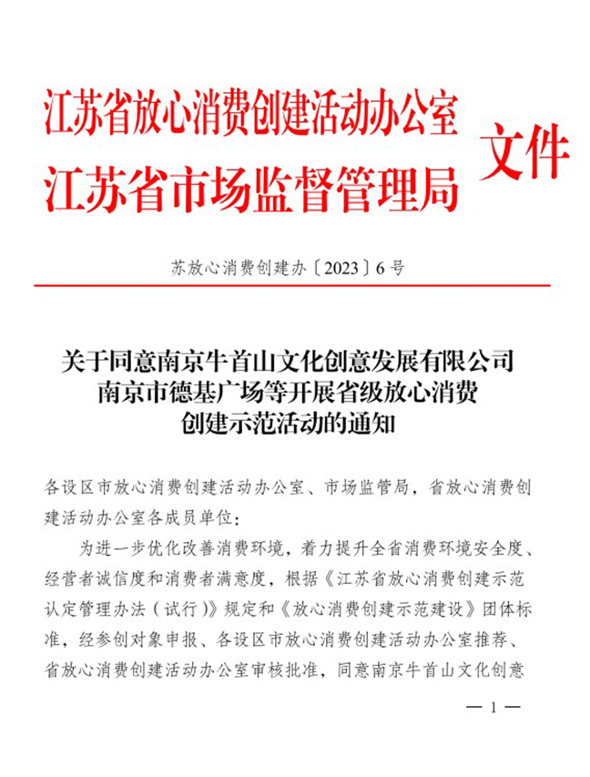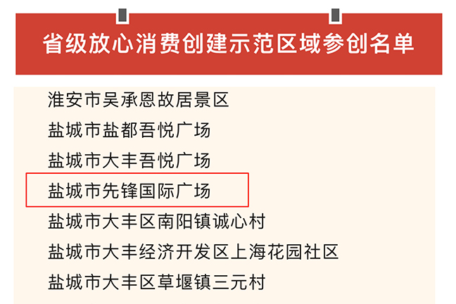 日前,江蘇省放心消費創(chuàng )建活動(dòng)辦公室、江蘇省市場(chǎng)監管局發(fā)布了2023年度江蘇省級放心消費創(chuàng )建示范單位、示范區域參創(chuàng )名單,集團先鋒國際廣場(chǎng)成功入選了省級放心消費創(chuàng )建示范區域參創(chuàng )名單。
