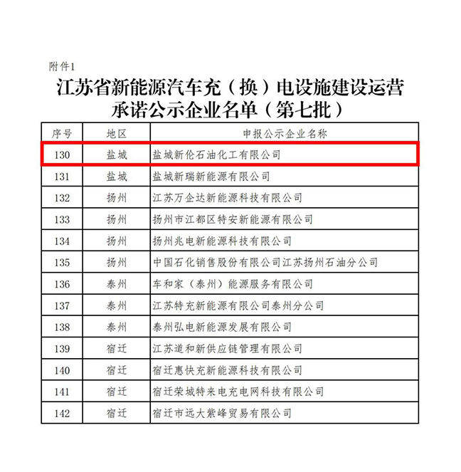 日前,省工信廳發(fā)布了《江蘇省新能源汽車(chē)充(換)電設施建設運營(yíng)承諾公示企業(yè)(第七批)名單》,鹽城新倫石化公司榜上有名,正式納入我省電動(dòng)汽車(chē)充電設施運營(yíng)服務(wù)商目錄。