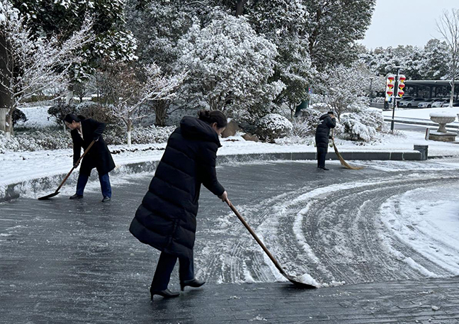 在凜冽的寒風(fēng)中,鹽城迎賓館黨員干部職工自發(fā)組成“掃雪突擊隊”,大家躬著(zhù)身子,迎“寒”而上,揮著(zhù)鐵鍬,掃的掃、鏟的鏟,路面積雪和冰層很快被鏟起并集中堆放,為出行的車(chē)輛、人員開(kāi)辟出一條方便安全的通道,用實(shí)際行動(dòng)給寒冷的冬日增添了一份溫暖,也展現了酒店黨員干部職工樂(lè )于奉獻的精神風(fēng)貌。