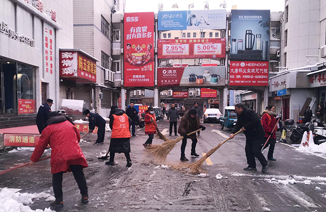 鹽城招商場(chǎng)“聞雪而動(dòng)”,組織市場(chǎng)管理人員、保潔人員、商戶(hù)志愿者到周邊道路、停車(chē)場(chǎng)、居民樓坡道開(kāi)展義務(wù)掃雪活動(dòng),并做好宣傳發(fā)動(dòng)工作,動(dòng)員市場(chǎng)商戶(hù)積極參與到活動(dòng)中來(lái)。大家干勁十足、團結協(xié)作、有序清理,市場(chǎng)周邊積雪情況得到了極大緩解,及時(shí)保障了消費者及來(lái)往行人的出行暢通。同時(shí),公司還組織人員赴各號樓逐層檢查,排除冰棱墜落安全隱患,進(jìn)一步保障人員出入安全。