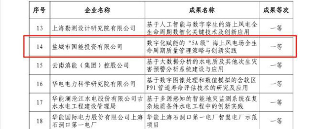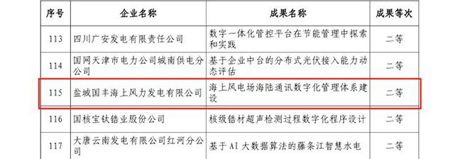 近日,中國水利電力質(zhì)量管理協(xié)會(huì )發(fā)布《關(guān)于公布2025年水利電力行業(yè)數字化質(zhì)量創(chuàng )新成果交流活動(dòng)評價(jià)結果的通知》,集團能源板塊國能公司《數字化賦能的“5A級”海上風(fēng)電場(chǎng)全生命周期質(zhì)量管理策略與創(chuàng )新實(shí)踐》、國豐公司《海上風(fēng)電場(chǎng)海陸通訊數字化管理體系建設》兩項創(chuàng )新成果脫穎而出,分別榮獲一等獎與二等獎。