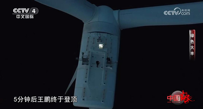 傍晚,風(fēng)電場(chǎng)的運維人員王鵬要對15號風(fēng)機進(jìn)行檢修,馬諾打算一同前往。這座風(fēng)機出水高度約120米,相當于40層樓高,為了保證上機人員的安全,他們必須要穿戴好特制的防護裝置。要想進(jìn)入風(fēng)機內艙,馬諾和王鵬要先爬到風(fēng)機外部10米高的平臺上,由于上風(fēng)機的難度很大,程序繁瑣,王鵬每次都會(huì )提前準備好所有的物資,用繩子吊上去。