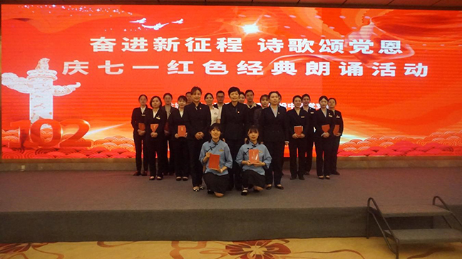 為慶祝中國共產(chǎn)黨成立102周年,弘揚偉大建黨精神,抒發(fā)愛(ài)黨愛(ài)國情懷,6月29日下午,鹽城國投大酒店黨支部聯(lián)合國投中科黨支部以“奮進(jìn)新征程 詩(shī)歌頌黨恩”為主題,開(kāi)展了慶“七一”紅色經(jīng)典誦讀活動(dòng)。